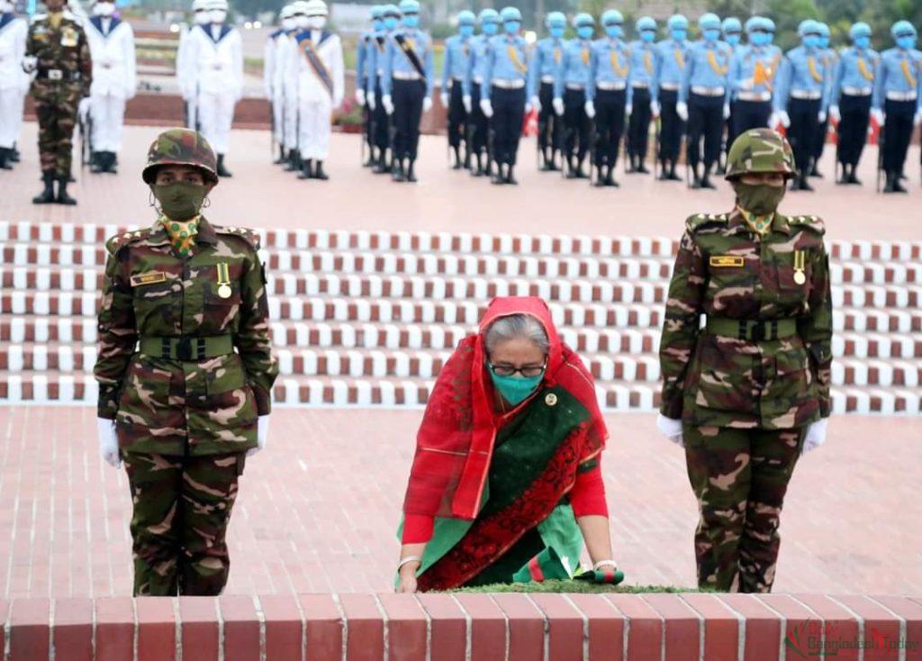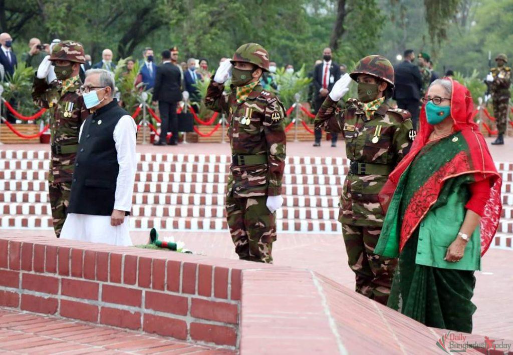 শ্রদ্ধা নিবেদনের পর সেখানে এক মিনিট নীরবে দাঁড়িয়ে থাকেন তিনি। এ সময় সশস্ত্র বাহিনীর একটি চৌকস দল রাষ্ট্রীয় অভিবাদন জানায় এবং বিউগলে করুণ সুর বেজে উঠে।রাষ্ট্রপতির পরপরই জাতির সূর্যসন্তানদের শ্রদ্ধা নিবেদন করেন প্রধানমন্ত্রী শেখ হাসিনা। শ্রদ্ধা নিবেদনের পর এক মিনিট নীরবে দাঁড়িয়ে থাকেন প্রধানমন্ত্রী।