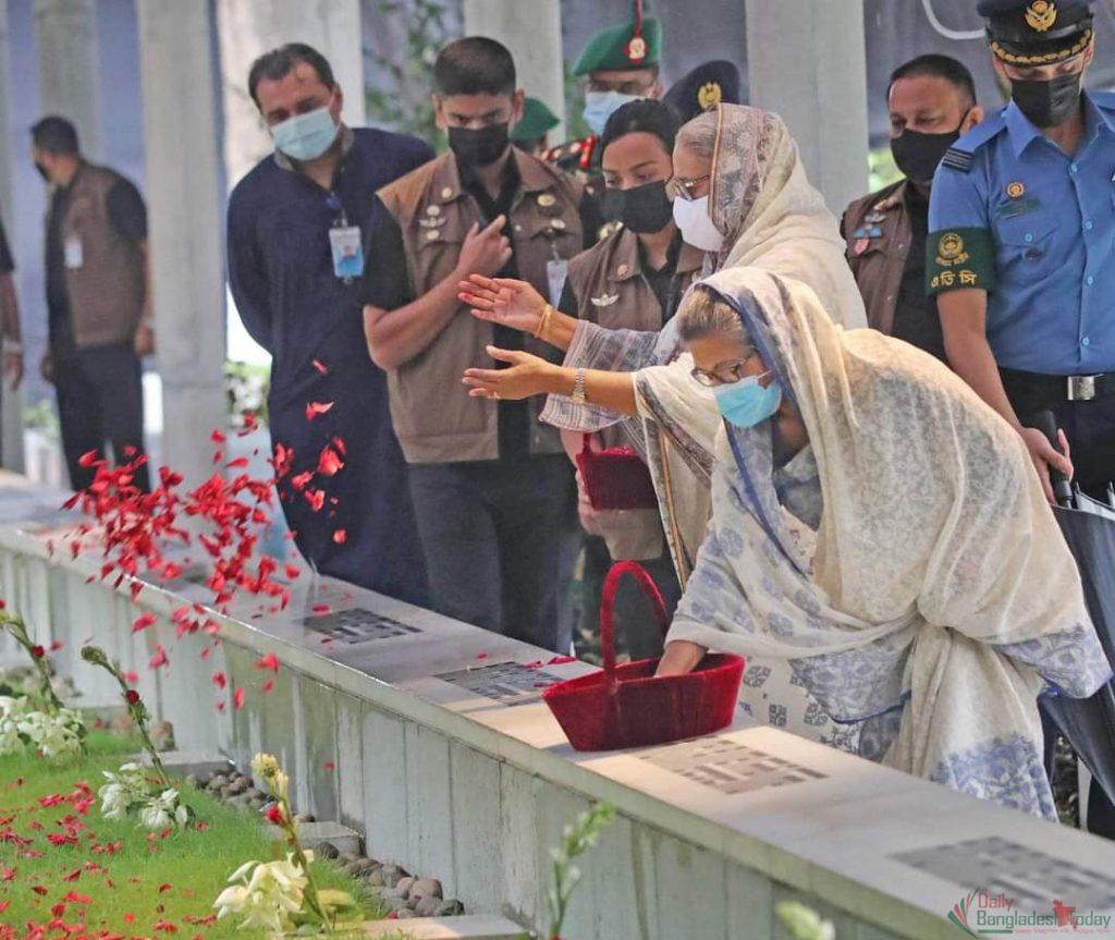 কায়েস জানান, শেখ হাসিনা ও শেখ রেহানা শহীদদের কবরে গোলাপের পাপড়ি ছিটিয়ে দেন।