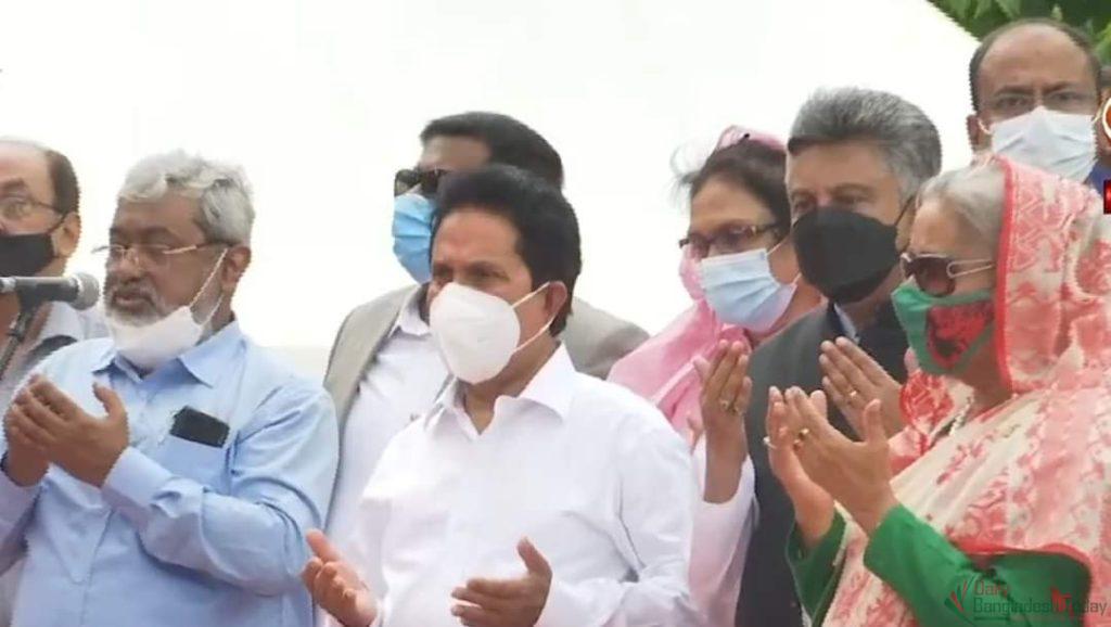 এরপর তাঁর গাড়িবহর সেতু উদ্বোধনের জন্য ফলকের স্থানে যায়।প্রধানমন্ত্রীসহ অতিথিরা সেখানে প্রথমে মোনাজাত করেন।