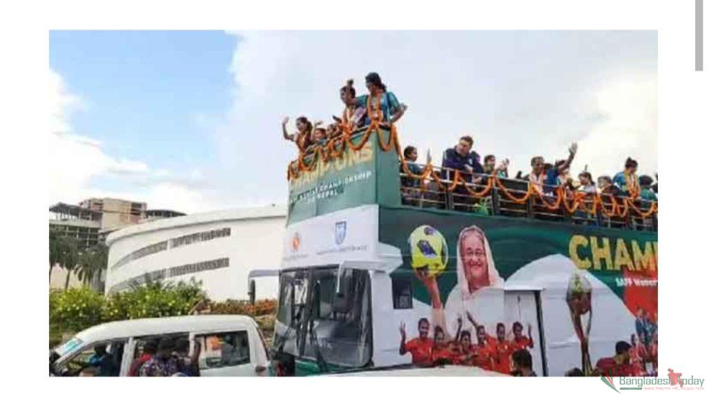 বাংলাদেশ নারী দল সোমবার নেপালকে ৩-১ গোলে হারিয়ে প্রথমবার সাফ শিরেপা জিতেছে। দেশের ক্রীড়াঙ্গনের বড় এই অর্জনে যুব ও ক্রীড়া মন্ত্রণালয় এবং বাফুফের উদ্যোগে মেয়েদের চাওয়া মতো ছাদখোলা বাসের ব্যবস্থা করে বিজয় উদযাপন শুরু হয়।
