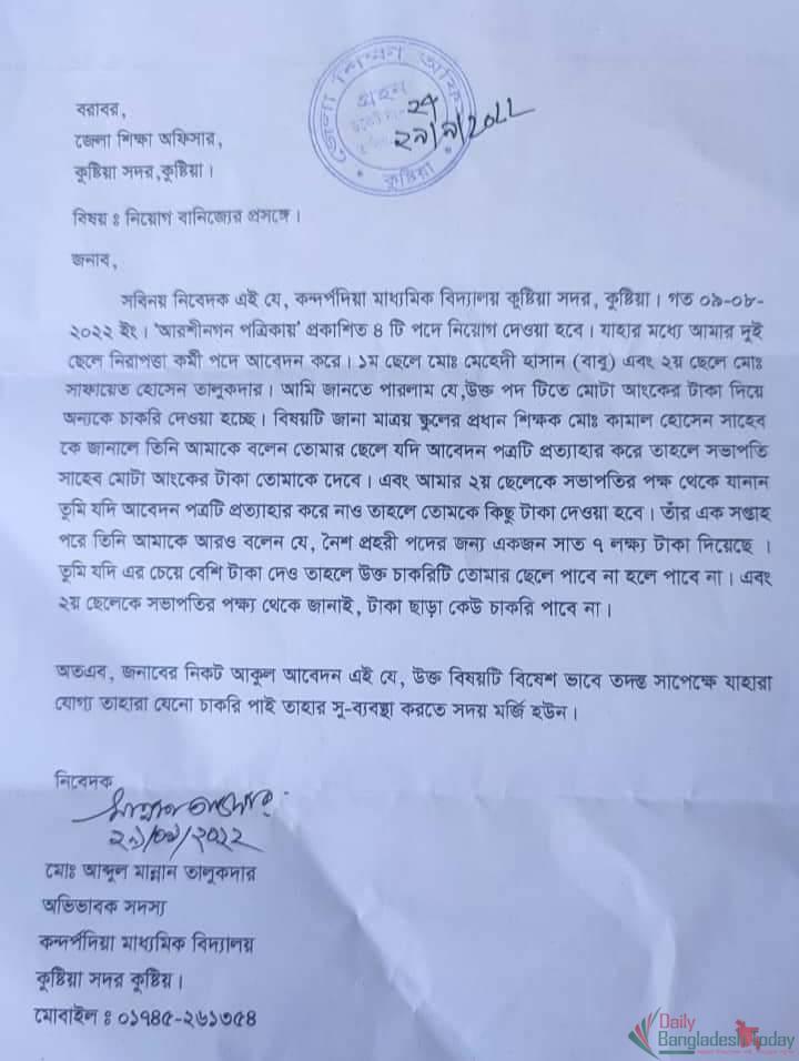এ ব্যাপারে কুষ্টিয়া জেলা শিক্ষা অফিসারের মুঠোফোনে যোগাযোগ করা হলে তিনি জানান, লিখিত অভিযোগের বিষয়টি আমার ঠিক মনে নেই। তবে নিয়োগ নিয়ে যদি কোন রকম ঘুষ বানিজ্য হয় তাহলে তদন্ত সাপেক্ষে আইনগত ব্যাবস্থা গ্রহন করা হবে।