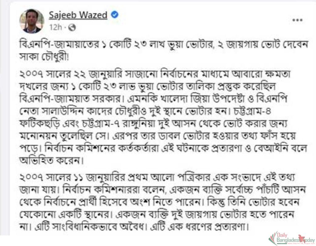 গতকাল শুক্রবার রাতে সামাজিক যোগাযোগমাধ্যম নিজের ভেরিফায়েড ফেসবুকে পেজে এ কথা বলেন তিনি।সজীব ওয়াজেদ জয় বলেন, ২০০৭ সালের ২২ জানুয়ারি সাজানো নির্বাচনের মাধ্যমে আবারো ক্ষমতা দখলের জন্য ১ কোটি ২৩ লাভ ভুয়া ভোটার তালিকা প্রস্তুক করেছিল বিএনপি-জাাময়াত সরকার।