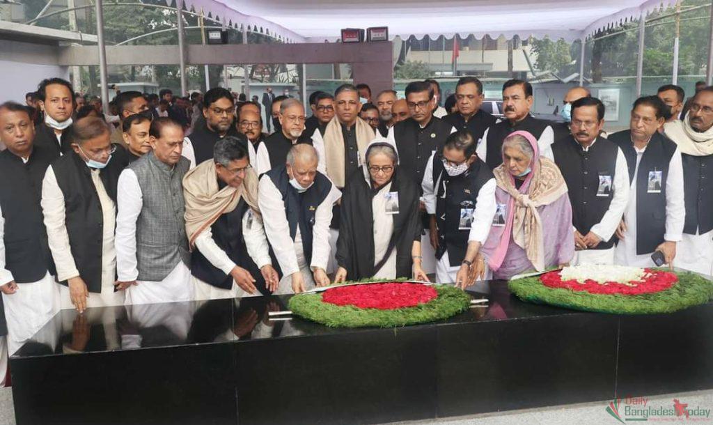 বুধবার সকাল ৭টার দিকে রাজধানীর মিরপুরে বুদ্ধিজীবী স্মৃতিসৌধে ফুল দিয়ে শ্রদ্ধা জানান তারা।রাষ্ট্রপতি ও প্রধানমন্ত্রীর শ্রদ্ধা নিবেদনের পর স্পিকার ড. শিরীন শারমিন চৌধুরী, প্রধান বিচারপতি হাসান ফয়েজ সিদ্দিকীসহ রাষ্ট্রের অন্যান্য গুরুত্বপূর্ণ ব্যক্তিবর্গ ও আওয়ামী লীগের পক্ষ থেকে ফুল দিয়ে বুদ্ধিজীবীদের শ্রদ্ধা জানানো হয়।