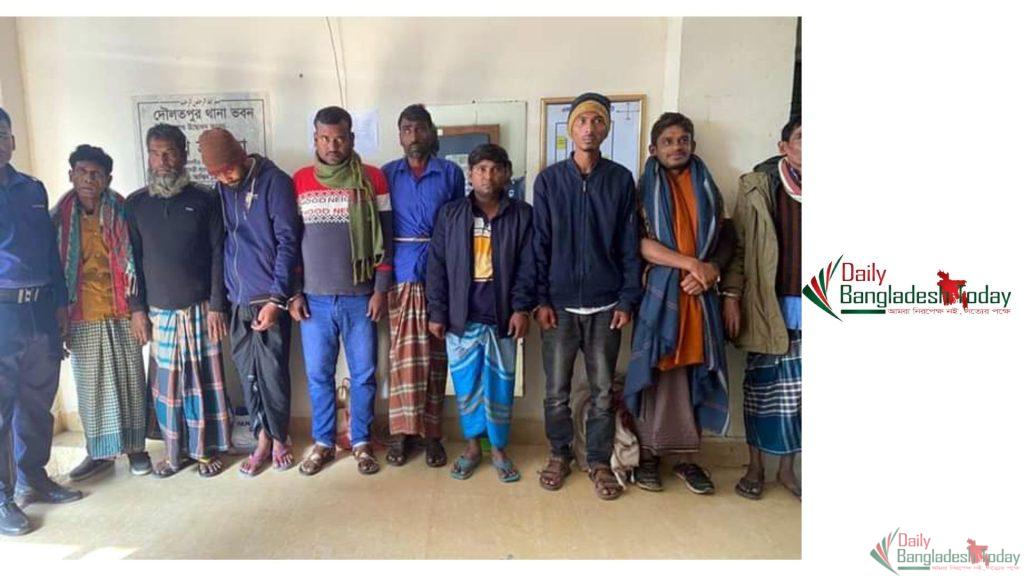 গ্রেফতারকৃত আসামিরা মৃত পটল মন্ডল এর ছেলে গোলাম রসুল (৫৫), মোক্তার এর ছেলে বিতান (৪৮), মনিরুল ইসলাম এর ছেলে মাসুদুজ্জামান ছোটন (২৭), লেবু মোল্লার ছেলে মোখলেসুর রহমান (৫২), আনারুল এর ছেলে মোশাররফ হোসেন (৪৫), ইয়াকুব আলী’র ছেলে মুসা মন্ডল (৪৫), বায়েজ মন্ডল এর ছেলে রাকিবুল ইসলাম বশির (৩২), নজরুল এর ছেলে নাজমুল (২৪), আফজাল এর ছেলে বশিকুল ইসলাম (৩২), আতর আলী’র ছেলে কবিরুল ইসলাম (৪৫), তাজ উদ্দিন এর স্ত্রী হীরা খাতুন (৩৮)। এবিষয়ে (ওসি) মজিবুর রহমান জানান, দৌলতপুর থানা পুলিশ অবৈধ অস্ত্র ও মাদক উদ্ধার, জঙ্গি, সন্ত্রাসী, ওয়ারেন্টভুক্ত পলাতক আসামী গ্রেপ্তারে নিয়মিত অভিযান পরিচালনা করছে এবং এই অভিযান অব্যাহত থাকবে। আজ গ্রেফতারকৃতদের আদালতের মাধ্যমে জেল হাজতে প্রেরণ করা হবে বলে জানান তিনি।