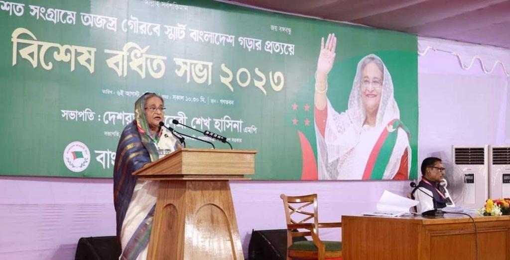 প্রধান অতিথির বক্তব্যে প্রধানমন্ত্রী বলেন, উন্নয়নশীল দেশ হিসেবে ২০২৬ সালে যাত্রা শুরু করবে। জনগণ চাইলে দেশ এগিয়ে যাবে। উন্নয়নশীল দেশ হিসেবে দেশকে এগিয়ে নিতে আওয়ামী লীগকে ভোট দিতে হবে।তিনি আরও বলেন, স্বাধীনতার পরে একটা চক্রান্ত শুরু হয়। সেই চক্রান্তে আওয়ামী লীগ নেতাকর্মী ও জনপ্রতিনিধিদের হত্যা করা হয়। ২১ বছর আমাদের শুধু আহতদের চিকিৎসা ও লাশ টানতে হয়েছে। বিএনপিকে খুনিদের দল আখ্যা দিয়ে প্রধানমন্ত্রী বলেন, এদের হাতে দেশ ও দেশের মানুষ নিরাপদ না।