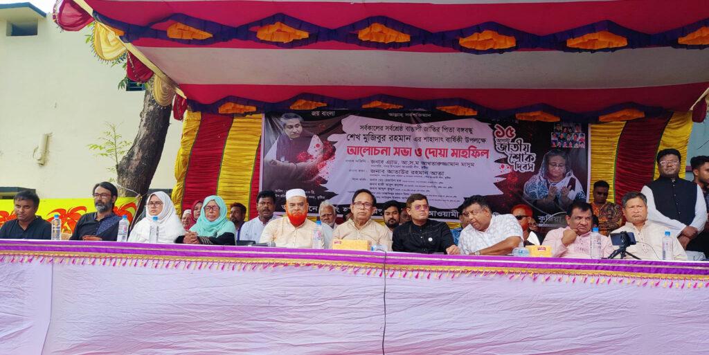কে এম শাহীন রেজা, কুষ্টিয়া জেলা প্রতিনিধি ॥ কুষ্টিয়া সদর উপজেলা আওয়ামীলীগ ও শহর আওয়ামীলীগের মাসব্যাপী জাতীয় শোক দিবস পালন উপলক্ষে শুক্রবার বিকাল ৫ ঘটিকার সময় কুষ্টিয়া সদর উপজেলার হাটশ হরিপুর ইউনিয়ন আওয়ামী লীগের আয়োজনে হাটশ হরিপুর ইউনিয়ন আওয়ামী লীগের সভাপতি মোস্তাফিজুর রহমান মিলন মন্ডলের সভাপতিত্বে দি ওল্ড কুষ্টিয়া হাই স্কুল প্রাঙ্গনে আলোচনা সভা ও দোয়া মাহফিলে অনুষ্ঠিত হয়।