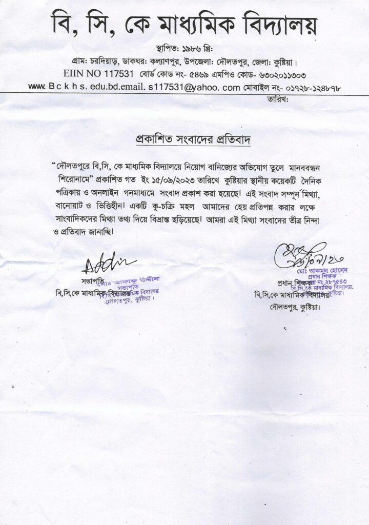 একটি কু-চক্রি মহল আমাদের হেয় প্রতিপন্ন করার লক্ষে সাংবাদিকদের মিথ্যা তথ্য দিয়ে বিভ্রান্ত ছড়িয়েছে। আমরা ওই মিথ্যা সংবাদের তীব্র নিন্দা ও প্রতিবাদ জানাচ্ছি। মো: আফাজ উদ্দীন , মোঃ আকমল হোসেনসভাপতি প্রধান শিক্ষকবি,সি,কে মাধ্যমিক বিদ্যালয় বি,সি,কে মাধ্যমিক বিদ্যালয় দৌলতপুর, কুষ্টিয়া।