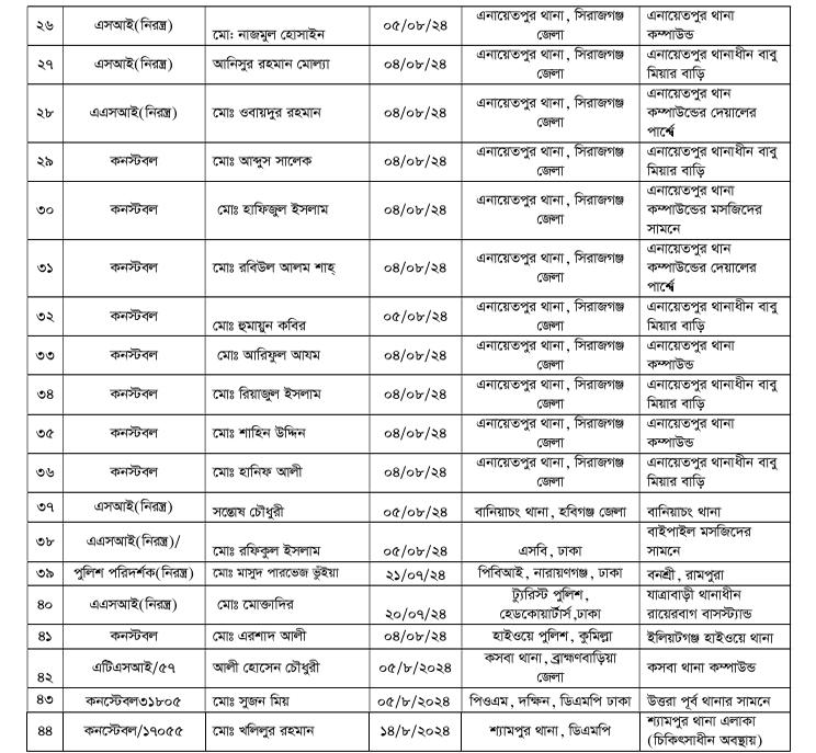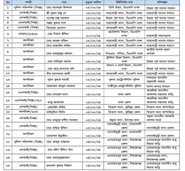 গণঅভ্যুত্থানে নিহত পুলিশ সদস্যদের সংখ্যা নিয়ে বিভ্রান্তি এড়াতে সদর দফতরের প্রকাশিত ওই তালিকা শুক্রবার (২৫ অক্টোবর) প্রধান উপদেষ্টার প্রেস উইং থেকে গণমাধ্যমে পাঠানো হয়। ওই তালিকায় ৪৪ জনের মৃত্যুর তথ্য জানানো হয়েছে।তালিকায় নিহতদের নাম, পদের নাম, মৃত্যুর তারিখ, সংযুক্ত ইউনিটের নাম এবং ঘটনাস্থল উল্লেখ করা হয়েছে।