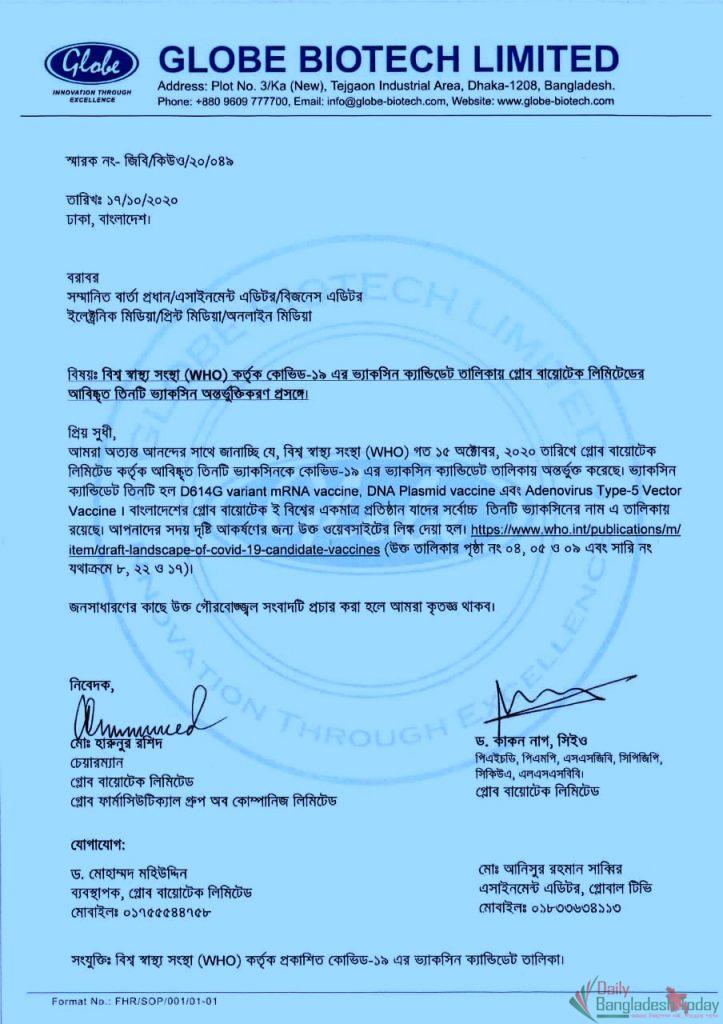 গ্লোব বায়োটিকের সংবাদ বিজ্ঞপ্তিতে বলা হয়, ‘বিশ্ব স্বাস্থ্য সংস্থা ১৫ অক্টোবর গ্লোব বায়োটেকের আবিষ্কৃত তিনটি ভ্যাকসিনকে কোভিড-১৯ ভ্যাকসিন ক্যান্ডিডেট তালিকায় অন্তর্ভূক্ত করেছে।’
