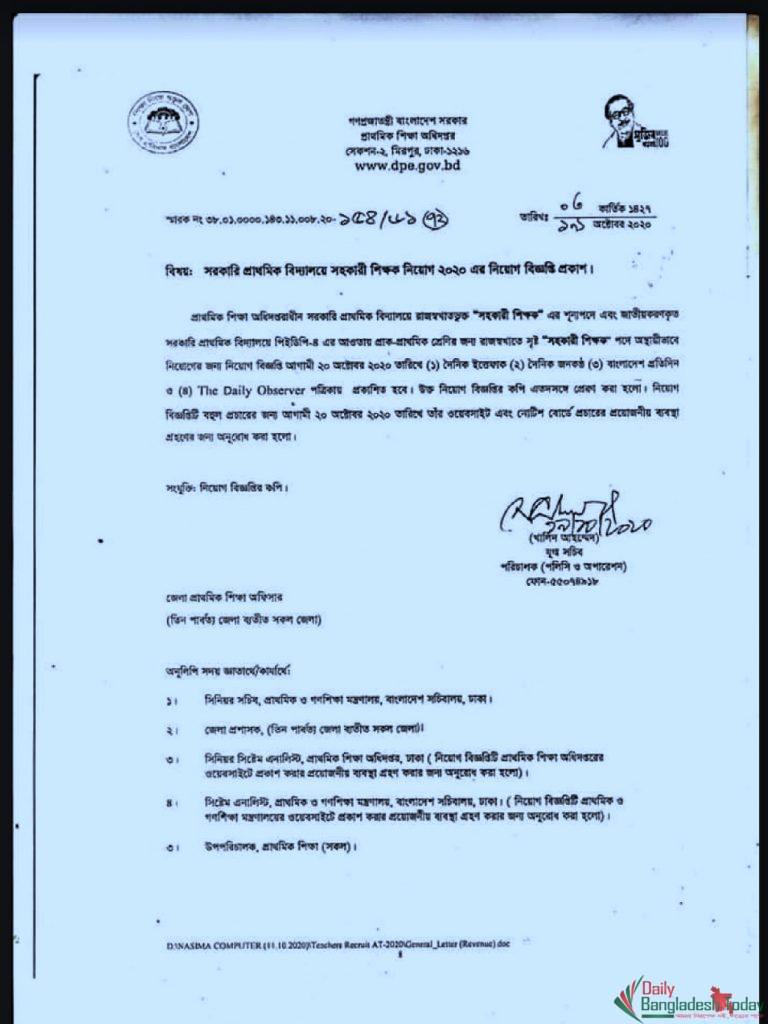 সোমবার (১৯ অক্টোবর) প্রাথমিক শিক্ষা অধিদফতরের নিয়োগ শাখার সহকারী পরিচালক আতিক বিন সাত্তার বিষয়টি নিশ্চিত করেছেন।