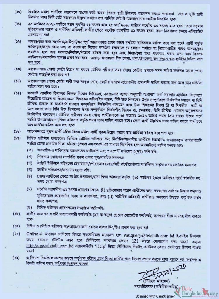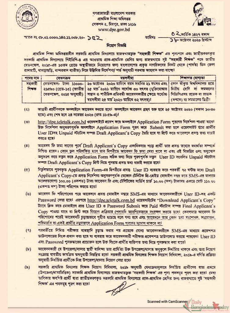 এ বিষয়ে ডিপিই থেকে প্রকাশিত বিজ্ঞপ্তিতে জানানো হয়, সরকারি প্রাথমিক বিদ্যালয়ে রাজস্বখাতভুক্ত ‘সহকারী শিক্ষক’ এর শূন্যপদ এবং জাতীয়করণ করা সরকারি প্রাথমিক বিদ্যালয়ে পিডিইপি-৪ এর আওতায় প্রাক-প্রাথমিক শ্রেণির জন্য রাজস্বখাতে সৃষ্ট ‘সহকারী শিক্ষক’ পদে জাতীয় বেতন স্কেল, ২০১৫ এর ১৩তম গ্রেডে অস্থায়ীভাবে নিয়োগ করা হবে। তবে তিন পার্বত্য জেলা রাঙ্গামাটি, খাগড়াছড়ি ও বান্দরবানের প্রার্থীরা এতে আবেদন করতে পারবেন না।