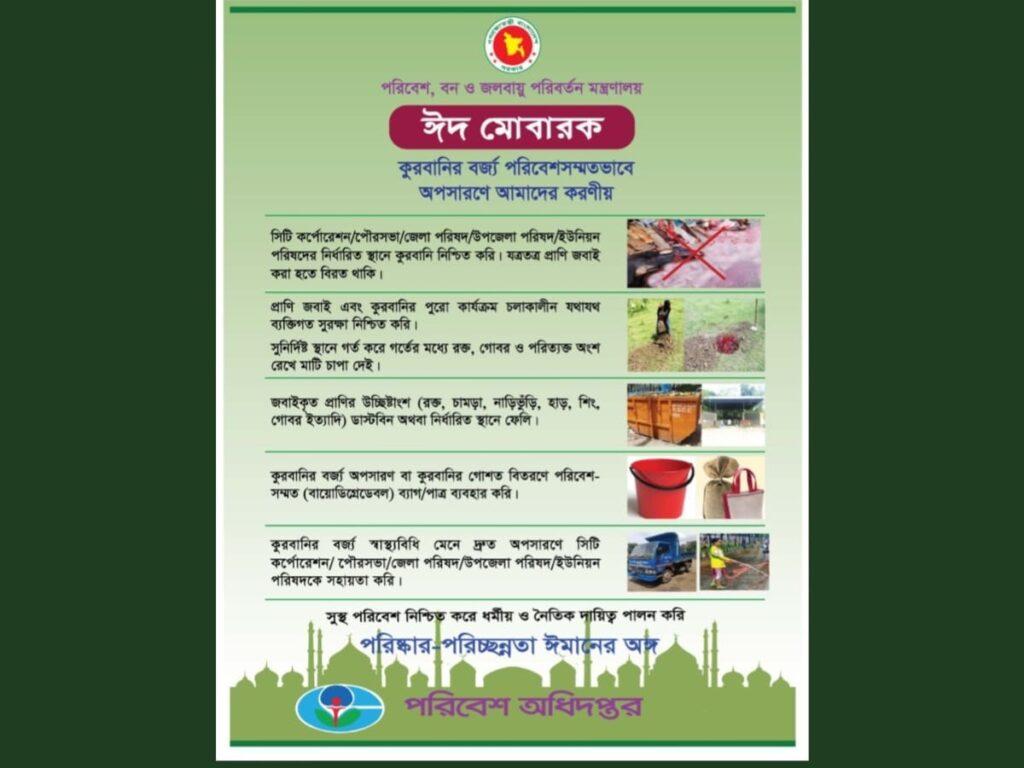 পবিত্র ঈদুল আজহা উপলক্ষ্যে কুরবানির পশুর বর্জ্য পরিবেশসম্মতভাবে ব্যবস্থাপনার নাগরিকের প্রতি আহ্বান জানিয়েছে পরিবেশ, বন ও জলবায়ু পরিবর্তন মন্ত্রণালয়। এ সময় যত্রতত্র পশু জবাই, উচ্ছিষ্ট ফেলা ও বর্জ্য ফেলে রাখার কারণে পরিবেশ দূষণ, স্বাস্থ্যঝুঁকি ও জনদুর্ভোগ তৈরি হয়, যা প্রতিরোধে সকলের সচেতন অংশগ্রহণ প্রয়োজন।