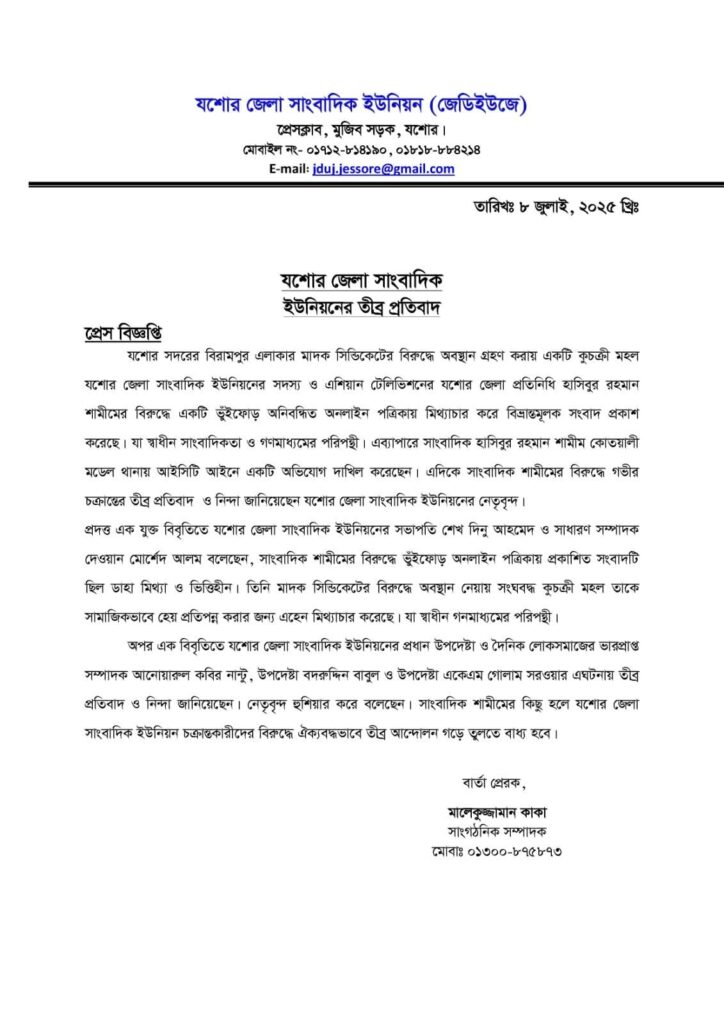 যশোর সদরের বিরামপুর এলাকার মাদক সিন্ডিকেটের বিরুদ্ধে সাহসী অবস্থান নেওয়ায় যশোর জেলা সাংবাদিক ইউনিয়ন (জেডিইউজে)-এর সদস্য ও এশিয়ান টেলিভিশনের যশোর জেলা প্রতিনিধি হাসিবুর রহমান শামীমের বিরুদ্ধে একটি ভুঁইফোড়, অনিবন্ধিত অনলাইন পোর্টালে মিথ্যা ও বিভ্রান্তিমূলক সংবাদ প্রকাশের তীব্র প্রতিবাদ জানিয়েছে যশোর জেলা সাংবাদিক ইউনিয়ন। এই ঘটনাকে স্বাধীন সাংবাদিকতা ও গণমাধ্যমের পরিপন্থী উল্লেখ করে ইউনিয়ন নেতারা গভীর উদ্বেগ প্রকাশ করেছেন।
