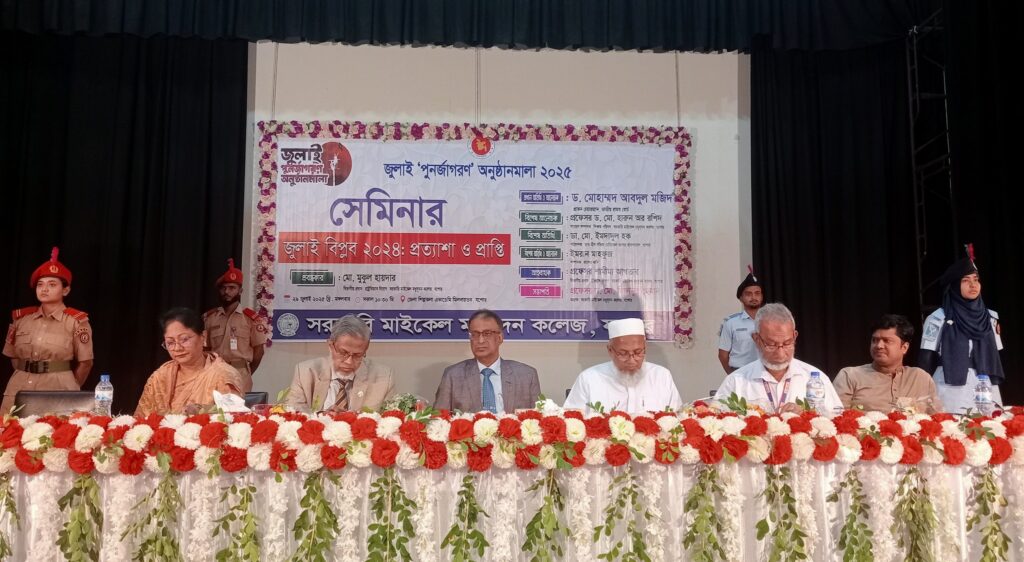 সরকারি মাইকেল মধুসূদন কলেজ(এমএম কলেজ) আয়োজিত ‘জুলাই বিপ্লব ২০২৪: প্রত্যাশা ও প্রাপ্তি’ শীর্ষক সেমিনার অনুষ্ঠিত হয়েছে। মঙ্গলবার সকালে জেলা শিল্পকলা একাডেমি মিলনায়তনে এই সেমিনার অনুষ্ঠিত হয়।