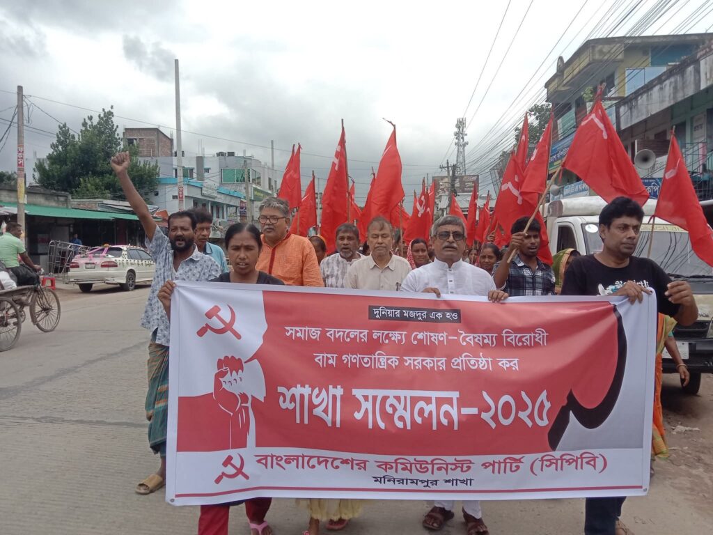 বাংলাদেশের কমিউনিস্ট পার্টি (সিপিবি) মনিরামপুর শাখার সম্মেলন শুক্রবার (২৯ আগস্ট) অনুষ্ঠিত হয়েছে। সমাজ বদলের লক্ষ্যে শোষণ-বৈষম্য বিরোধী বাম গণতান্ত্রিক সরকার প্রতিষ্ঠার লড়াইকে জোরদার করার আহ্বান জানিয়ে এই সম্মেলন সম্পন্ন হয়।