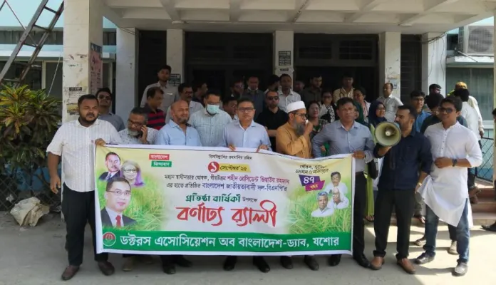 বাংলাদেশ জাতীয়তাবাদী দল (বিএনপি)-এর ৪৭তম প্রতিষ্ঠাবার্ষিকী উপলক্ষে যশোরে বর্ণাঢ্য র্যালির আয়োজন করেছে ডক্টরস অ্যাসোসিয়েশন অব বাংলাদেশ (ড্যাব) যশোর শাখা। সোমবার (১ সেপ্টেম্বর) সকাল সাড়ে ৯টা থেকে প্রায় ২০ মিনিটব্যাপী এ র্যালি অনুষ্ঠিত হয় যশোর ২৫০ শয্যা বিশিষ্ট সদর হাসপাতালের প্রশাসনিক ভবনের সামনে।