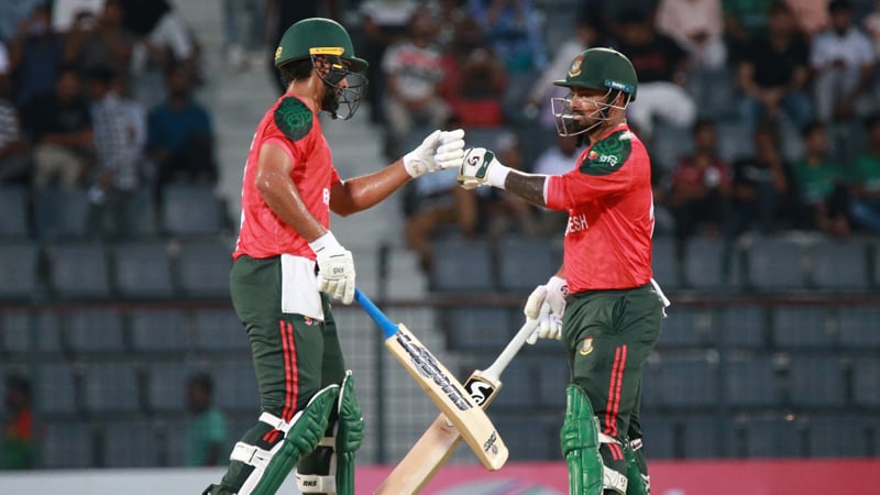 বাংলাদেশ ৯ ওভারে ২ উইকেট হারিয়ে ৮২ রানে ব্যাট করছে। লিটন দাস ২৯ বলে ৫২ রান করে খেলছেন। পাঁচটি চার ও তিনটি ছক্কা মেরেছেন তিনি। তার সঙ্গী শামীম পাটোয়ারি। সাইফ ৮ বলে ১২ করে ফিরেছেন। হৃদয় ১৪ বলে ৯ রান করে আউট হয়েছেন।