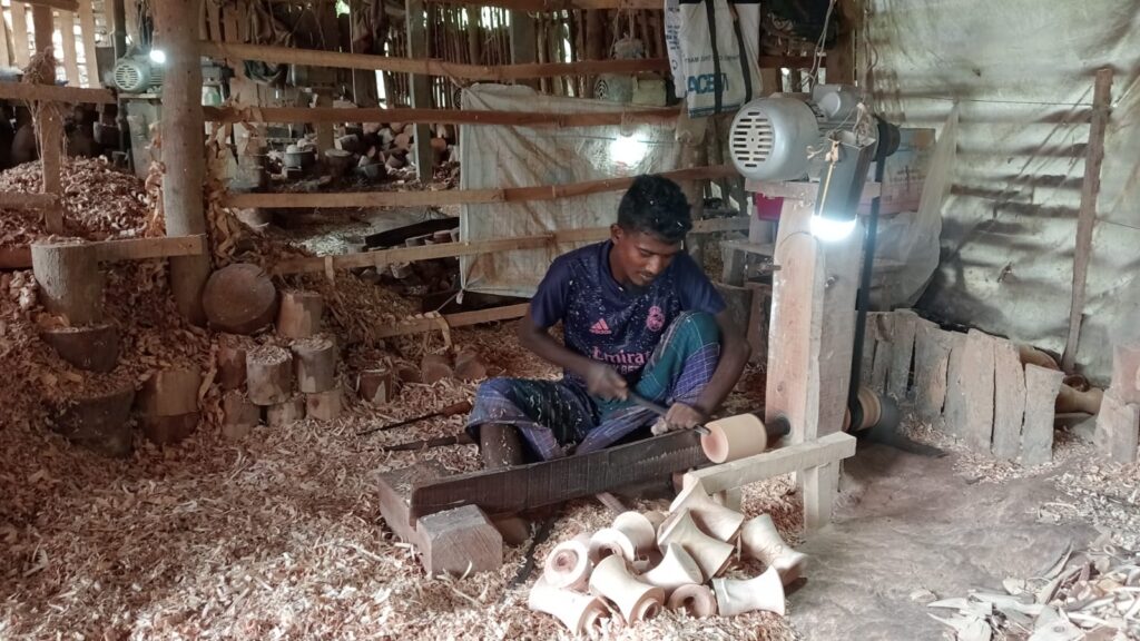 এক সময়ের দিনমজুর বা অন্যের জমিতে কামলা খেটে খাওয়া মানুষগুলো এখন এই কুটির শিল্পের মাধ্যমে স্বাবলম্বী। ছোট ছোট কাঠের টুকরা থেকে তৈরি হচ্ছে বিভিন্ন ধরনের মোমদানি, ফুলদানি, চুড়ির আলনা, কলস, বাটি, খুনতিসহ নানা ধরনের নিত্য ব্যবহার্য সামগ্রী।