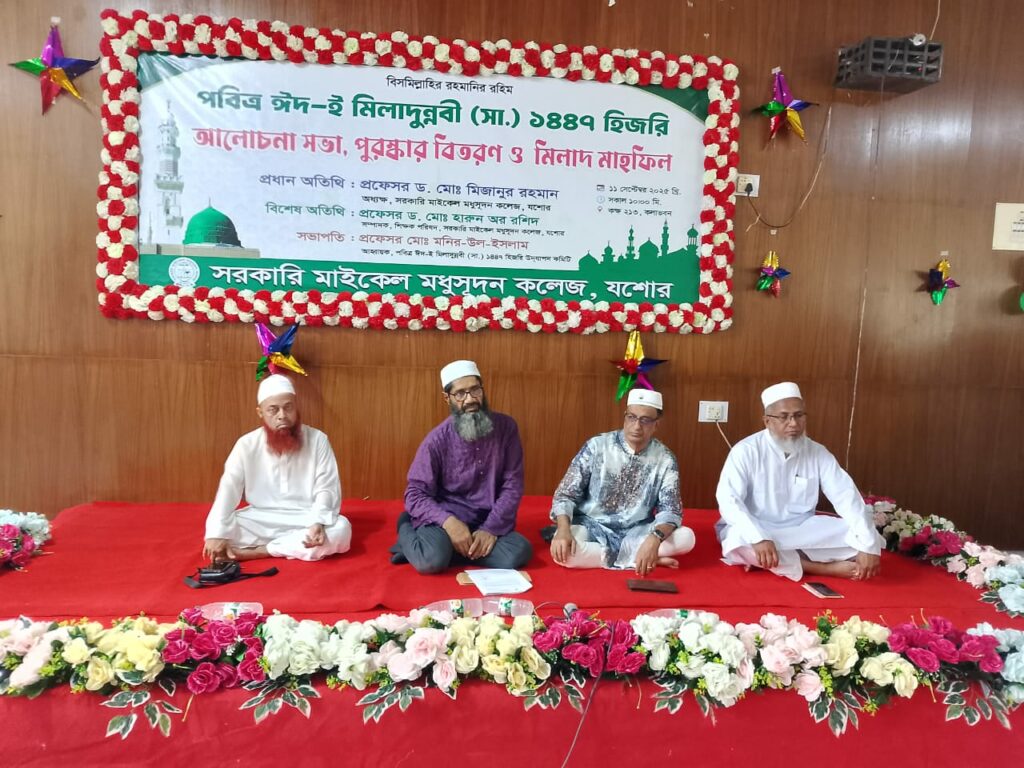 পবিত্র ঈদ-ই-মিলাদুন্নবী (সা.) উপলক্ষে যশোর সরকারি মাইকেল মধুসূদন কলেজে (এম এম কলেজ) এক আলোচনা সভা, দোয়া মাহফিল ও পুরস্কার বিতরণী অনুষ্ঠান অনুষ্ঠিত হয়েছে। বৃহস্পতিবার সকালে কলেজের আব্দুল হাই কলা ভবনের ২১৩ নম্বর কক্ষে এই অনুষ্ঠানের আয়োজন করা হয়।