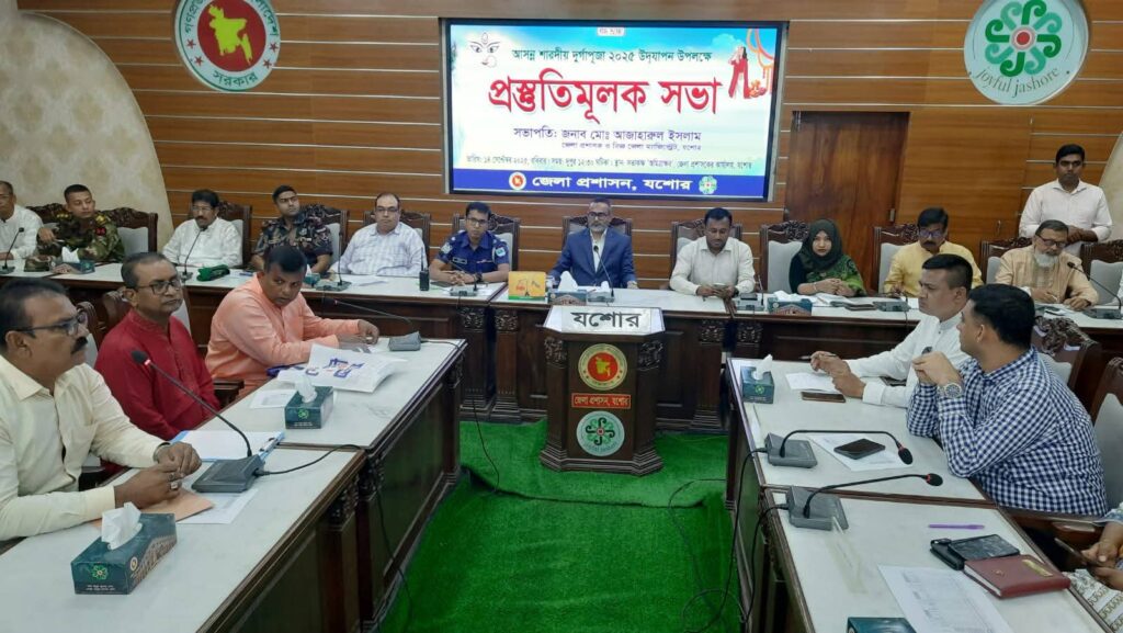 রোববার যশোর জেলা প্রশাসকের কার্যালয়ে শারদীয় দুর্গাপূজা উদযাপনের প্রস্তুতি সভা হয়েছে। জেলা প্রশাসক আজাহারুল ইসলামের সভাপতিত্বে সভায় পূজা উদযাপন পরিষদ, হিন্দু বৌদ্ধ খ্রিস্টান ঐক্য ফ্রন্ট, রাজনৈতিক দলের নেতৃবৃন্দ ও প্রশাসনের শীর্ষ কর্মকর্তারা অংশ নেন। সভায় শারদীয় দুর্গাপূজা উপলক্ষে স্বরাষ্ট্র মন্ত্রণালয়ের জারি করা নির্দেশনাগুলো তুলে ধরে মেনে চলার আহ্বান জানানো হয়। নিরাপত্তার স্বার্থে সব নির্দেশনার সঙ্গে একমত হলেও সন্ধ্যা ৭টার মধ্যে প্রতীমা বিসর্জনের বিষয়ে আপত্তি জানান সনাতন ধর্মাবলম্বী নেতারা। তারা দাবি করেন, বিসর্জনের সময় বৃদ্ধি করে রাত ১০টা পর্যন্ত করার।