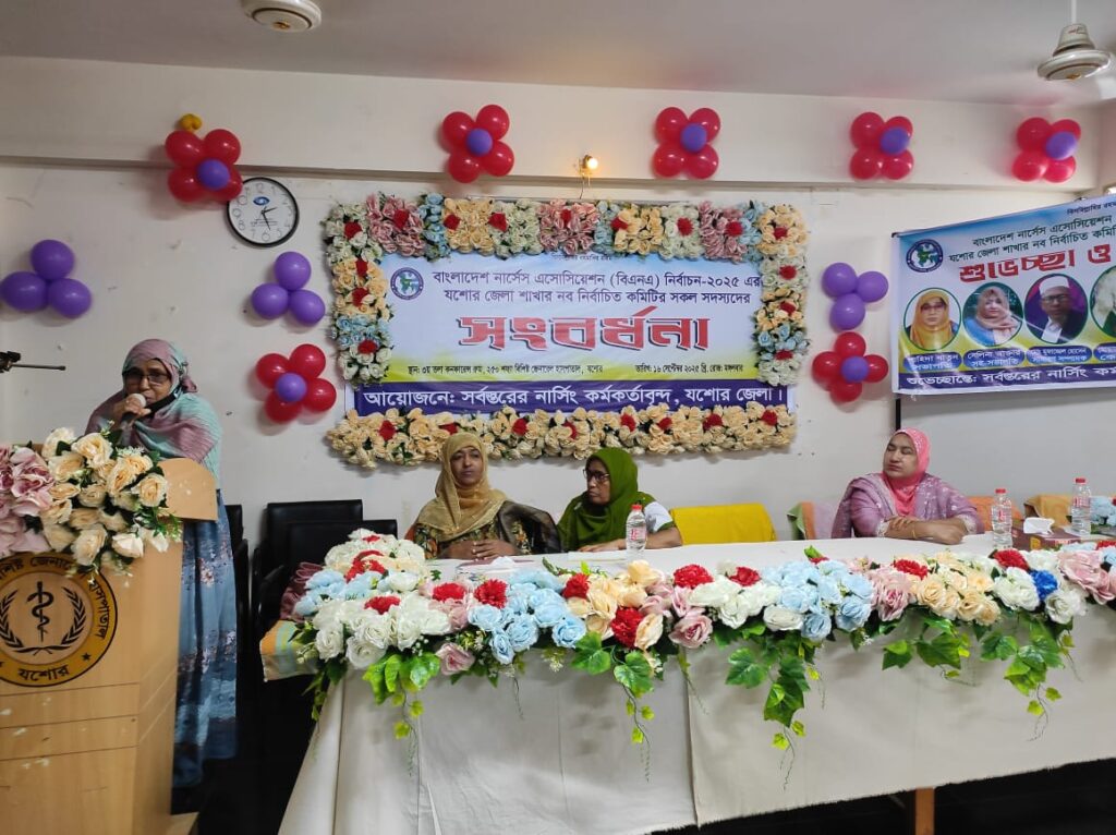 যশোর ২৫০ শয্যা বিশিষ্ট জেনারেল হাসপাতালের কনফারেন্স রুমে বাংলাদেশ নার্সেস অ্যাসোসিয়েশন নির্বাচনে যশোর জেলা শাখার নবনির্বাচিত কমিটির সংবর্ধনা অনুষ্ঠিত হয়। মঙ্গলবার সকালে এই সংবর্ধনা অনুষ্ঠিত হয়। অনুষ্ঠানের সভাপতিত্ব করেন উপ-সেবা তত্ত্বাবধায়ক (ভারপ্রাপ্ত) রহিমা বেগম।