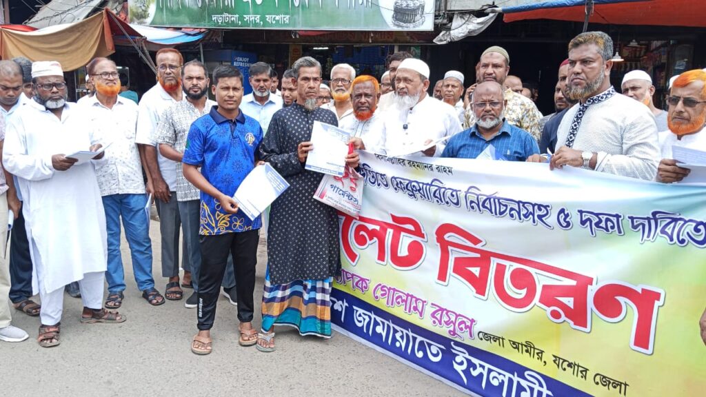 জাতীয় সনদের ভিত্তিতে ফেব্রুয়ারিতে নির্বাচনের দাবিতে ৫ দফা কর্মসূচির অংশ হিসেবে বৃহস্পতিবার (১৮ সেপ্টেম্বর) দুপুরে যশোরে লিফলেট বিতরণ করেছে বাংলাদেশ জামায়াতে ইসলামী।