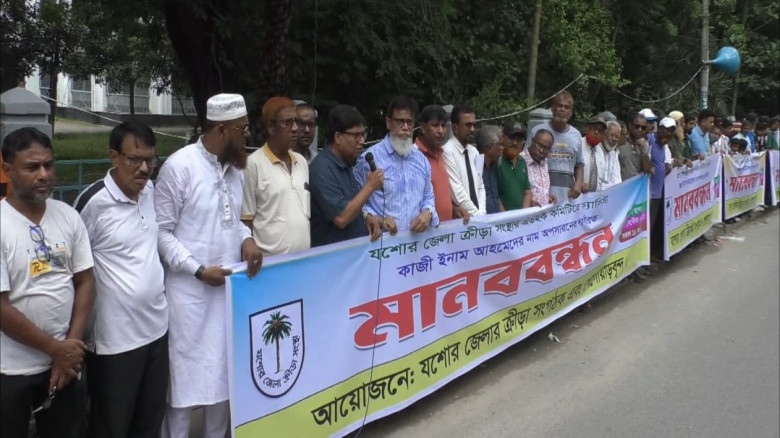 বাংলাদেশ ক্রিকেট বোর্ডের (বিসিবি) সাবেক পরিচালক কাজী এনাম আহমেদকে যশোর ক্রীড়া সংস্থার অ্যাডহক কমিটি থেকে অপসারণের দাবিতে মানববন্ধন করেছেন জেলার ক্রীড়া সংগঠক, সাবেক ও বর্তমান খেলোয়াড়রা। আজ সকালে প্রেসক্লাব যশোরের সামনে এ মানববন্ধন অনুষ্ঠিত হয়।