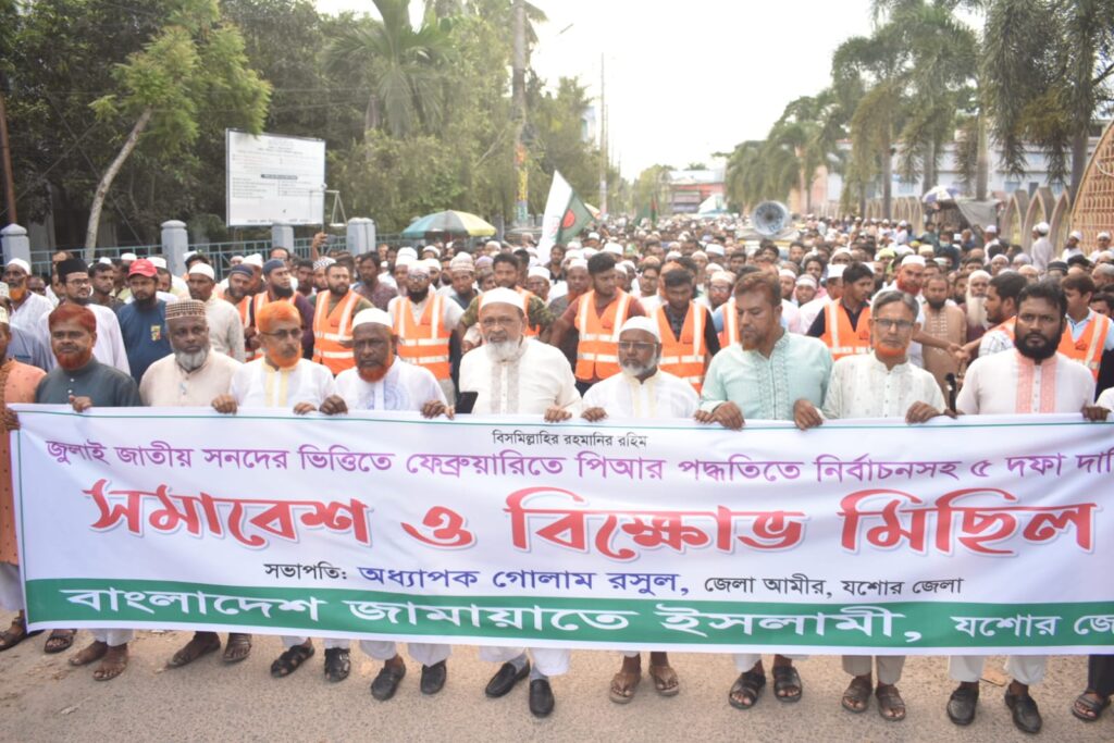 বাংলাদেশের বর্তমান রাজনৈতিক অচলাবস্থায় জামায়াতে ইসলামী ন্যায়ভিত্তিক ও জবাবদিহিমূলক গণতন্ত্র প্রতিষ্ঠার লক্ষ্যে পাঁচ দফা দাবি ঘোষণা করেছে। এ দাবির অংশ হিসেবে শুক্রবার বিকেলে যশোর জেলা জামায়াতের উদ্যোগে যশোর জজর্কোট চত্বর থেকে বিক্ষোভ মিছিল ও সমাবেশ অনুষ্ঠিত হয়।