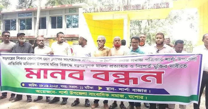 যশোর জেলা সাংবাদিক ইউনিয়নের নির্বাহী কমিটির সদস্য ও দৈনিক লোকসমাজের শার্শা প্রতিনিধি মনিরুল ইসলাম মনিকে মিথ্যা ও ষড়যন্ত্রমূলক মামলায় গ্রেফতারের প্রতিবাদে মানববন্ধন অনুষ্ঠিত হয়েছে।