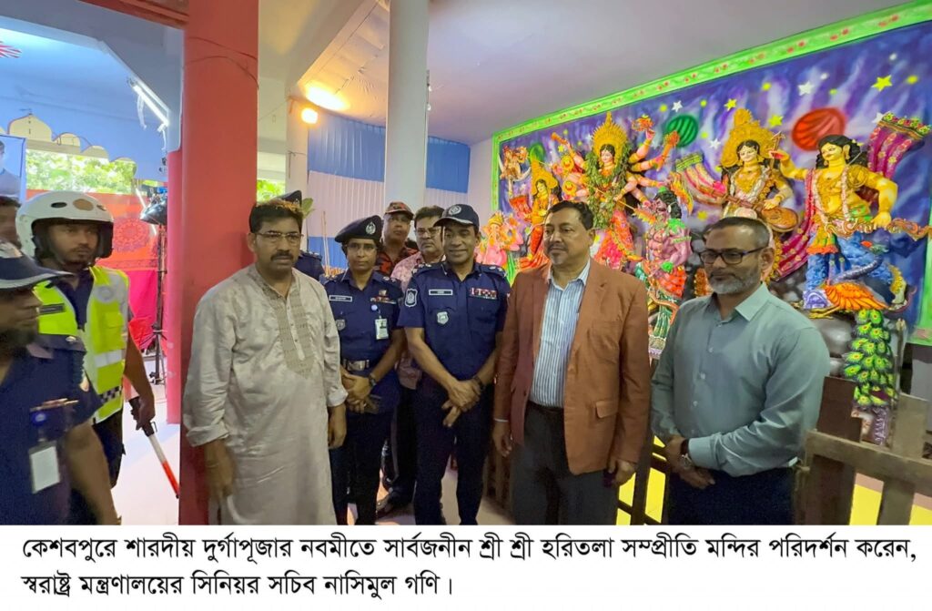 শারদীয় দুর্গাপূজা উপলক্ষে যশোরের কেশবপুর উপজেলায় চারটি পূজা মণ্ডপ পরিদর্শন করেছেন স্বরাষ্ট্র মন্ত্রণালয়ের সিনিয়র সচিব জনাব নাসিমুল গনি। বুধবার (০১ অক্টোবর) দুপুর ১২টা ৫০ মিনিট থেকে ২টা ৪৫ মিনিট পর্যন্ত তিনি মণ্ডপগুলো ঘুরে দেখেন এবং আয়োজক ও ভক্তদের সঙ্গে শুভেচ্ছা বিনিময় করেন।