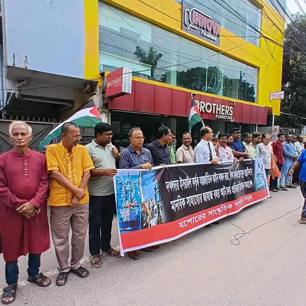 যশোরে গাজার জনগণের জন্য ত্রাণবাহী নৌবহর ‘গ্লোবাল সুমুদ ফ্লোটিলা’ আটকের প্রতিবাদে বিক্ষোভ সমাবেশ অনুষ্ঠিত হয়েছে। মঙ্গলবার সকাল সাড়ে ১১টায় যশোরের সাংস্কৃতিক সংগঠন সমূহের উদ্যোগে প্রেসক্লাব যশোরের সামনে এ বিক্ষোভ সমাবেশের আয়োজন করা হয়। বিক্ষোভ সমাবেশে সভাপতিত্ব করেন সংগঠনের সভাপতি দীপংকর দাস রতন।