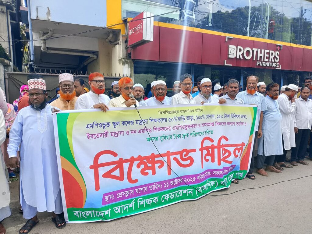 শনিবার সকালে যশোর প্রেসক্লাব যশোরের সামনে এই মানববন্ধন ও র্যালি করে বাংলাদেশ আদর্শ শিক্ষক ফেডারেশন (বাআশিফ) যশোর জেলা শাখা। মানববন্ধন শেষে একটি বিক্ষোভ র্যালি শহরের গুরুত্বপূর্ণ সড়ক প্রদক্ষিণ করে।