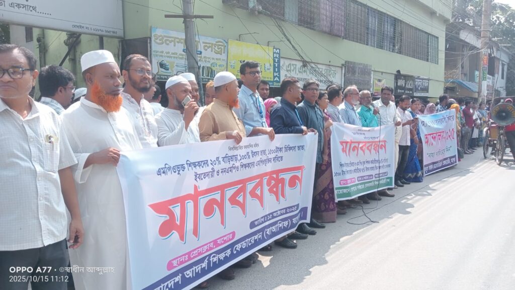 মানববন্ধনে শিক্ষক-কর্মচারিরা জানান, যশোর জেলায় প্রায় তেরশ এমপিওভুক্ত স্কুল, কলেজ ও মাদ্রাসা রয়েছে। তারমধ্যে প্রায় ৬০০ স্কুল, প্রায় ৪০০ কলেজ ও প্রায় ৩০০ মাদ্রাসা রয়েছে। সব শিক্ষক-কর্মচারিদের প্রাণের দাবি মূল বেতনের ২০ শতাংশ বাড়িভাড়া, ১৫০০ টাকা মেডিকেল ভাতা ও কর্মচারিদের ৭৫ শতাংশ উৎসব ভাতার দিতে হবে। দ্রুত সময়ে দাবি না মানা হলে শিক্ষক-কর্মচারিরা দেশব্যাপী কঠোর আন্দোলন কর্মসূচি দিতে বাধ্য হবেন।