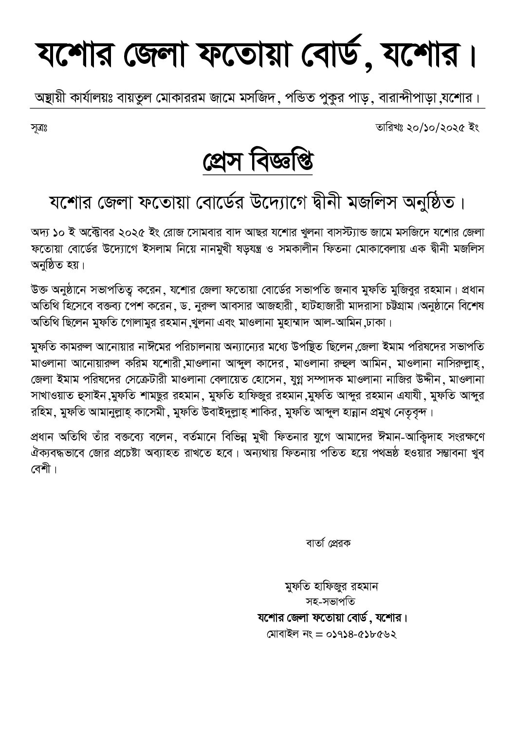 সোমবার বাদ আছর যশোর খুলনা বাসস্ট্যান্ড জামে মসজিদে এই মজলিস অনুষ্ঠিত হয়। অনুষ্ঠানে সভাপতিত্ব করেন, যশোর জেলা ফতোয়া বোর্ডের সভাপতি মুফতি মুজিবুর রহমান।
