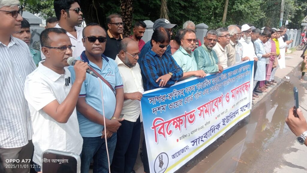সাংবাদিক দম্পতি সাগর সারওয়ার ও মেহেরুন রুনি হত্যাসহ সারাদেশে সকল সাংবাদিক হত্যার বিচার, নবম ওয়েজ বোর্ড বাস্তবায়ন, দশম ওয়েজ বোর্ড গঠন এবং চাকরিচ্যুত সাংবাদিকদের পুনর্বহালের দাবিতে বিক্ষোভ সমাবেশ ও মানববন্ধন করেছে সাংবাদিক ইউনিয়ন যশোরের সদস্যরা।