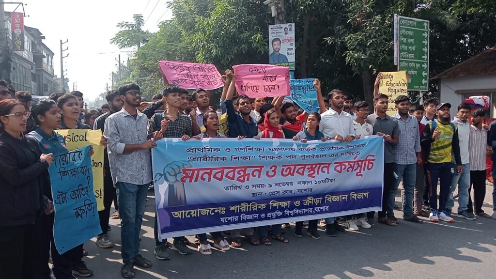 সরকারি প্রাথমিক বিদ্যালয়ে শারীরিক শিক্ষা বিষয় ও শিক্ষক পদ বাতিলের সিদ্ধান্তের প্রতিবাদে এবং তা অবিলম্বে পুনর্বহালের দাবিতে যশোর বিজ্ঞান ও প্রযুক্তি বিশ্ববিদ্যালয়ের (যবিপ্রবি) শারীরিক শিক্ষা ও ক্রীড়া বিজ্ঞান বিভাগের শিক্ষক ও শিক্ষার্থীরা প্রেসক্লাব যশোরের সামনে এক মানববন্ধন কর্মসূচি পালন করেছেন।