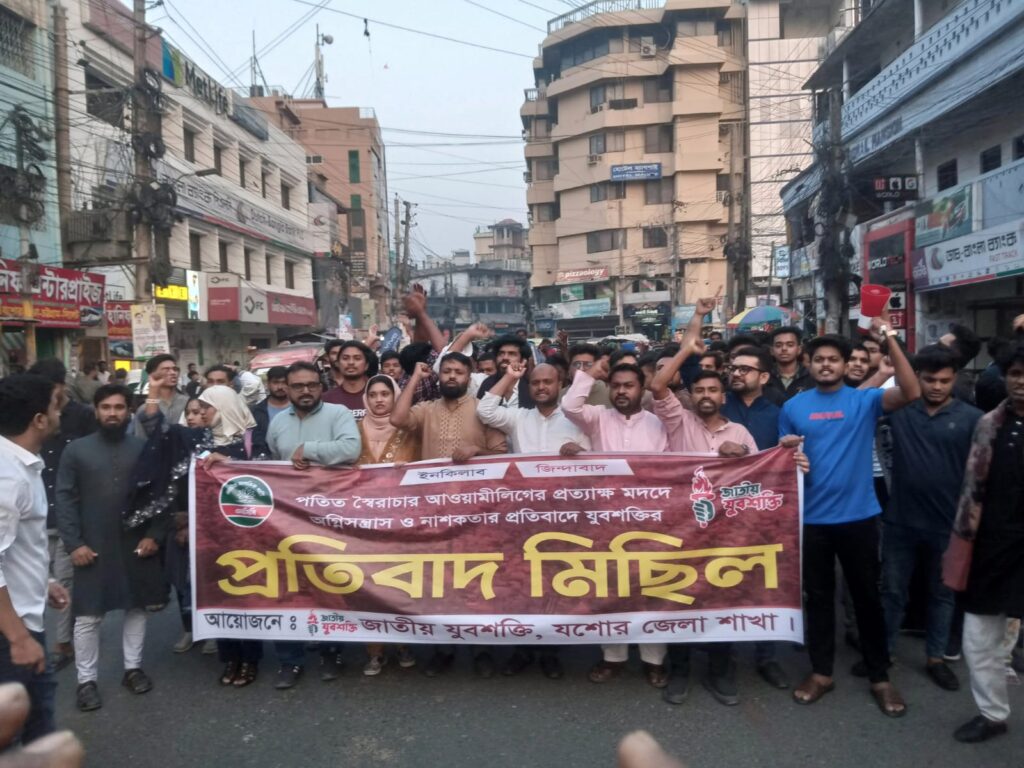 পতিত স্বৈরাচারের প্রত্যক্ষ মদদে চলমান অগ্নিসন্ত্রাস ও নাশকতার প্রতিবাদে এক প্রতিবাদ মিছিল ও সমাবেশ অনুষ্টিত হয়েছে। বৃহস্পতিবার বিকেলে দড়াটানার বকুলতলায় জাতীয় যুবশক্তির যশোর জেলা শাখার উদ্যোগে এই সমাবেশের আয়োজন করা হয়।