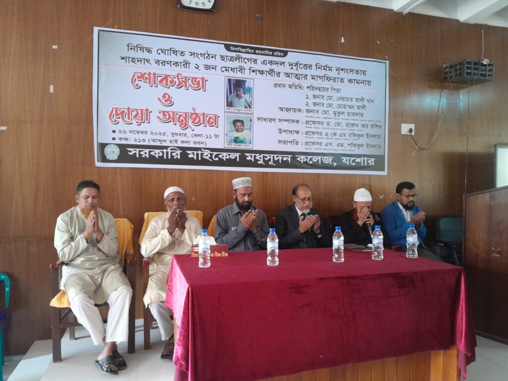 যশোর সরকারি মাইকেল মধুসূদন (এমএম) কলেজে ২০১৫ সালের ২৩ নভেম্বর ছাত্রলীগের দুর্বৃত্তদের নির্মম নৃশংসতায় নিহত দুই মেধাবী শিক্ষার্থী—হাবিবুল্লাহ হোসাইন ও কামরুল হাসানের স্মরণে শোকসভা ও দোয়া মাহফিল অনুষ্ঠিত হয়েছে। বুধবার কলেজের আব্দুল হাই কলা ভবনে এ আয়োজন হয়।