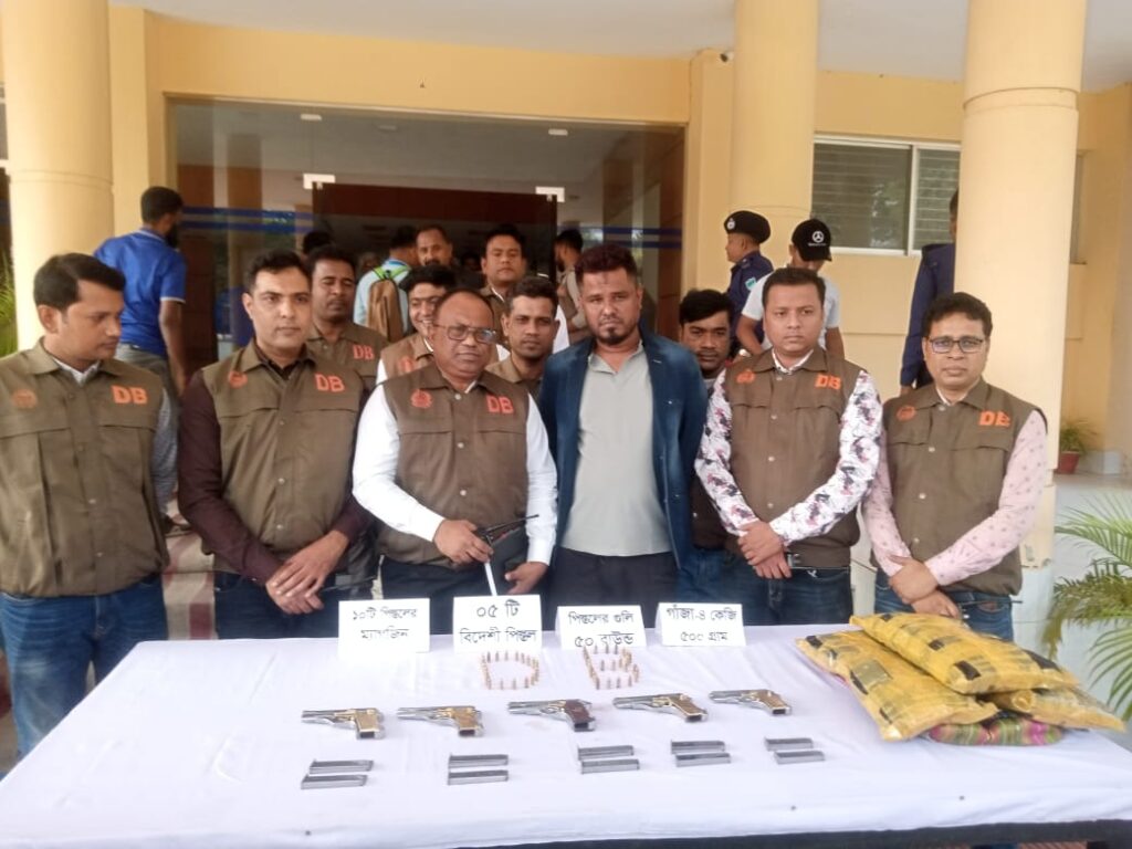 যশোর জেলা গোয়েন্দা শাখা (ডিবি) এক বিশেষ অভিযানে বিপুল পরিমাণ আগ্নেয়াস্ত্র ও মাদকসহ এক ব্যক্তিকে গ্রেফতার করেছে। গ্রেফতারকৃত আসামির কাছ থেকে ৫টি ৭.৬৫ এমএম বিদেশী পিস্তল, ১০টি ম্যাগজিন, ৫০ রাউন্ড গুলি এবং ৪ কেজি ৫০০ গ্রাম গাঁজা উদ্ধার করা হয়েছে।