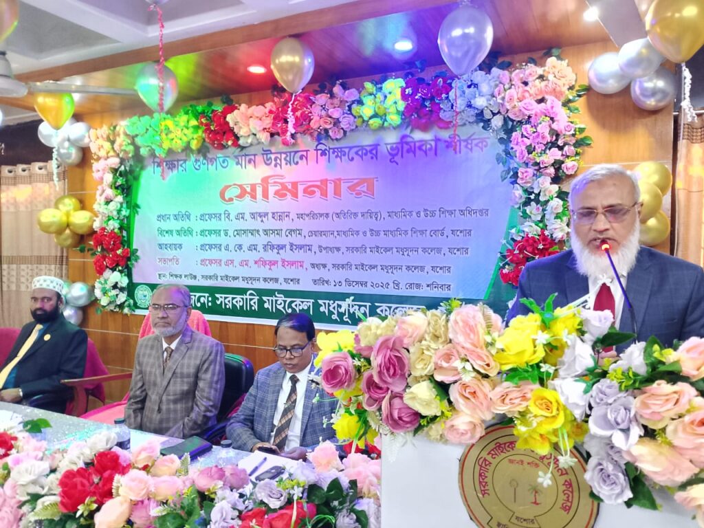 যশোরে শিক্ষার গুণগত মান উন্নয়নে শিক্ষকদের ভূমিকা শীর্ষক এক গুরুত্বপূর্ণ সেমিনার অনুষ্ঠিত হয়েছে। শনিবার সকালে যশোর সরকারি মাইকেল মধুসূদন (এম এম) কলেজের শিক্ষক লাউন্সে এই সেমিনার অনুষ্ঠিত হয়। সেমিনারে বক্তারা শিক্ষার মানোন্নয়নের জন্য শিক্ষক, শিক্ষার্থী, অভিভাবক এবং রাষ্ট্রের সম্মিলিত ভূমিকার উপর জোর দেন।
