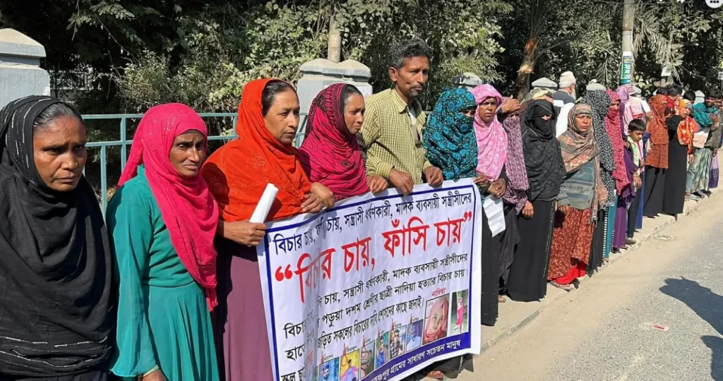 মানববন্ধনে নাদিয়ার স্বজন শিল্পি বেগম, সকিনা আক্তার, জলি খাতুন সহ স্থানীয় বহু মানুষ অংশ নেন। তারা অবিলম্বে এই ঘটনার সুষ্ঠু তদন্ত ও দ্রুত বিচারের মাধ্যমে প্রধান অভিযুক্ত প্রেমিক নাজমুলের ফাঁসির দণ্ড কার্যকর করার দাবি জানান। তাদের মতে, এটি একটি সুপরিকল্পিত হত্যাকাণ্ড, কোনোভাবেই আত্মহত্যা নয়।