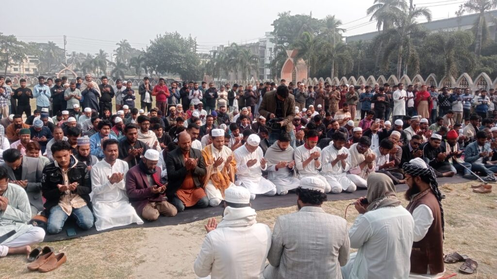 দোয়া মাহফিলের আগে উপস্থিত ছাত্র সমাজ ও সাধারণ মুসল্লিরা একই স্থানে জোহরের নামাজ জামাতের সঙ্গে আদায় করেন। নামাজ শেষে মরহুম শরীফ ওসমান হাদীর রুহের মাগফিরাত কামনা করে বিশেষ মোনাজাত করা হয়। আয়োজকরা গায়েবানা জানাজা আয়োজন করতে চাইলেও ধর্মীয় বিধি-নিষেধের কারণে উপস্থিত সকলের সম্মতিতে কেবল দোয়া মাহফিল অনুষ্ঠিত হয়।
