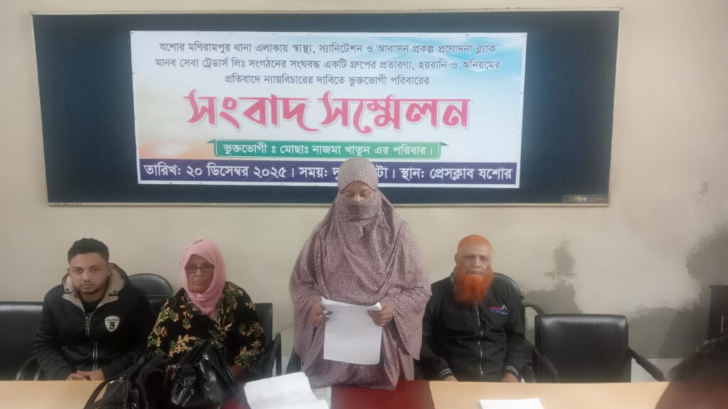 শনিবার দুপুরে যশোর প্রেসক্লাব মিলনায়তনে আয়োজিত এক সংবাদ সম্মেলনে মনিরামপুর উপজেলার ভুক্তভোগী মোঃ শফিকুজ্জামেনের স্ত্রী নাজমা খাতুন এই অভিযোগ করেন। তিনি দোষীদের দ্রুত দৃষ্টান্তমূলক শাস্তির দাবি জানান।