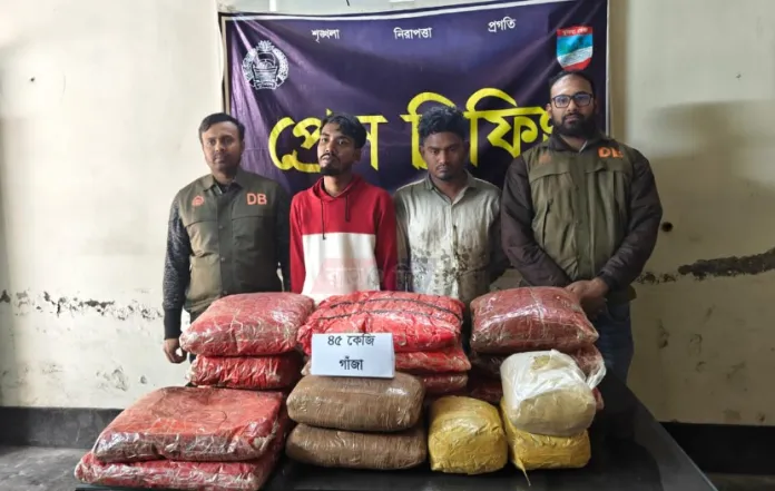 তল্লাশিকালে পিকআপের ভেতরে থাকা একটি খাটের মধ্যে অত্যন্ত সুকৌশলে লুকিয়ে রাখা একটি বস্তা জব্দ করা হয়। বস্তাটি খুলে আনুমানিক ৪৫ কেজি গাঁজা উদ্ধার করে পুলিশ