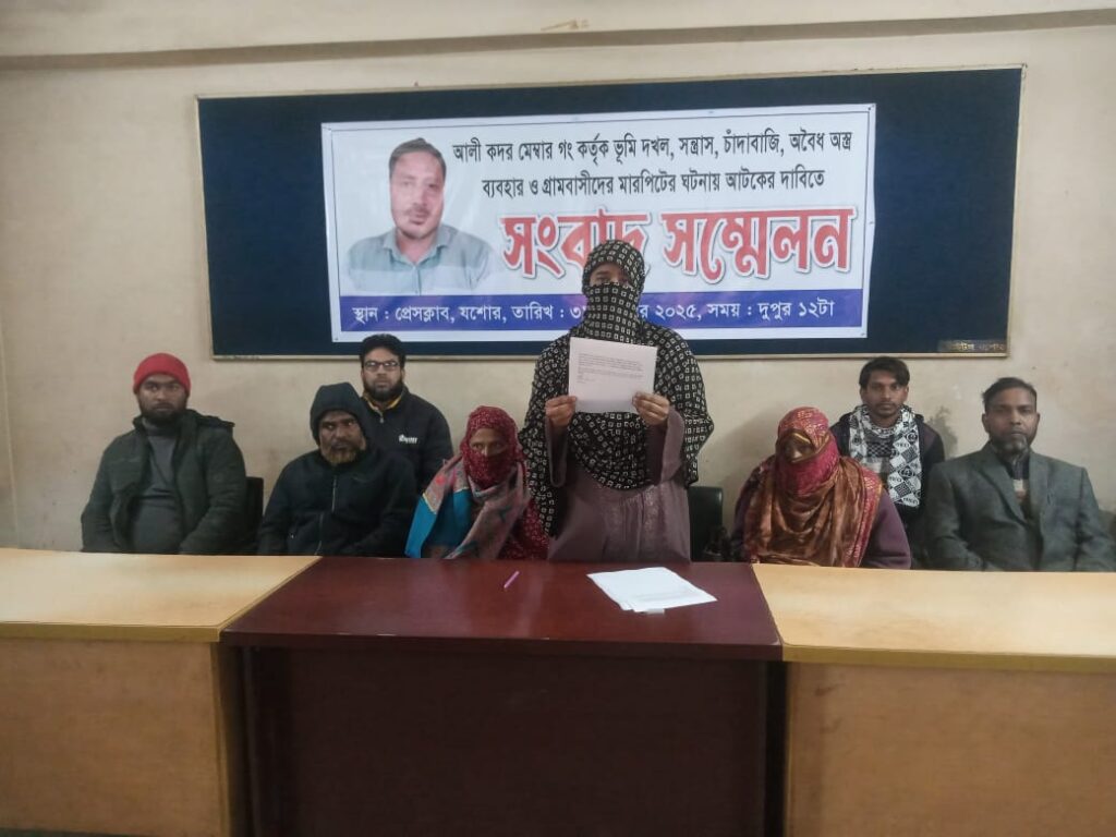 বুধবার দুপুরে প্রেসক্লাব যশোরে আয়োজিত এক সংবাদ সম্মেলনে ভুক্তভোগী মোছা. শাপলা খাতুন তার পরিবার ও গ্রামবাসীর ওপর হওয়া নির্যাতনের চিত্র তুলে ধরেন।