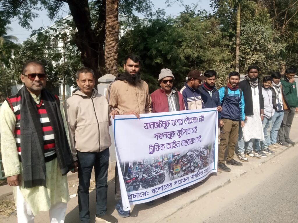 যানজট নিরসন, দখলমুক্ত ফুটপাত নিশ্চিতকরণ ও ট্রাফিক আইন কঠোরভাবে বাস্তবায়নের দাবিতে যশোরে মানববন্ধন কর্মসূচি পালন হয়েছে। শুক্রবার সকালে সচেতন নাগরিক সমাজের আয়োজনে এ মানববন্ধন অনুষ্ঠিত হয়।