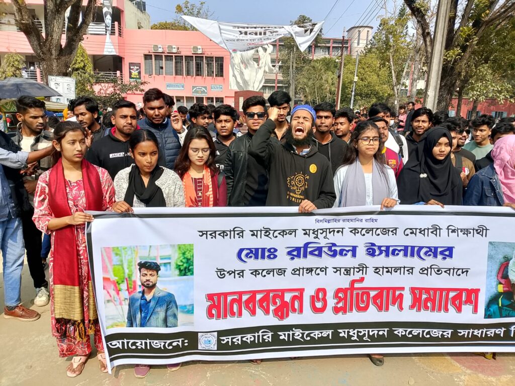যশোর সরকারি মাইকেল মধুসূদন (এম এম) কলেজের এক শিক্ষার্থীর ওপর হামলার প্রতিবাদে সাধারণ শিক্ষার্থীদের ব্যানারে বিক্ষোভ মিছিল ও মানববন্ধন অনুষ্ঠিত হয়েছে। রোববার দুপুরে কলেজ ক্যাম্পাসের চেতনায় চিরঞ্জীব ভাস্কর্যের পাদদেশে এ মানববন্ধন অনুষ্ঠিত হয়। মানববন্ধন শেষে শিক্ষার্থীরা ক্যাম্পাসে বিক্ষোভ মিছিল বের করে। মিছিলটি ক্যাম্পাস প্রদক্ষিণ করে পুনরায় চেতনায় চিরঞ্জীব ভাস্কর্যের সামনে এসে শেষ হয়। এই মানবন্ধন ও বিক্ষোভ কর্মসূচিতে কলেজের বিভিন্ন বিভাগের শিক্ষার্থী অংশ নেন। মানববন্ধনে অংশগ্রহণকারী শিক্ষার্থীরা নানা স্লোগানের মাধ্যমে হামলার ঘটনার নিন্দা ও প্রতিবাদ জানান।