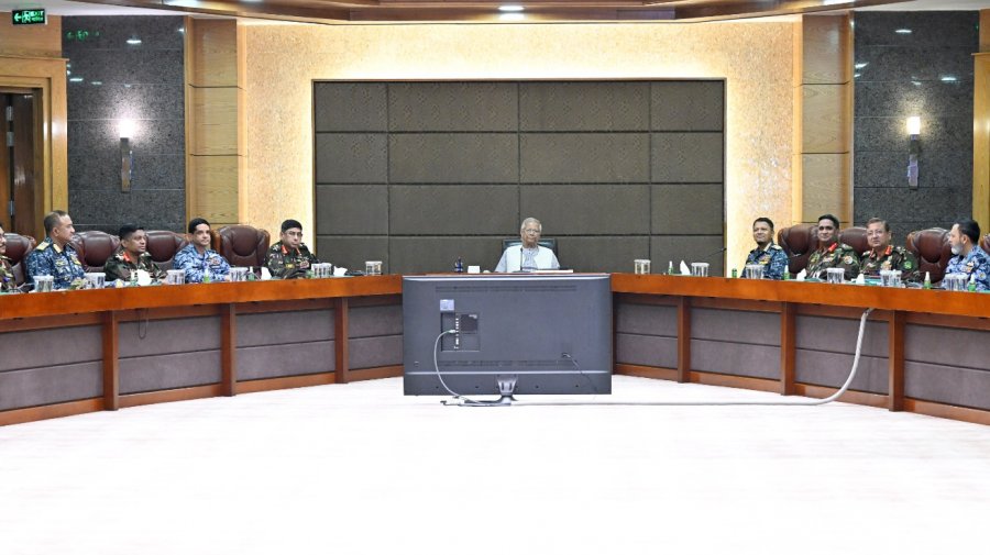 সেনা সদরের হেলমেট অডিটোরিয়ামে সশস্ত্র বাহিনীর ঊর্ধ্বতন কর্মকর্তাদের মতবিনিময় সভার অনুষ্ঠানস্থলে পৌঁছালে প্রধান উপদেষ্টাকে সেনাবাহিনী প্রধান জেনারেল ওয়াকার-উজ-জামান, নৌবাহিনী প্রধান এডমিরাল এম নাজমুল হাসান, বিমানবাহিনী প্রধান এয়ার চিফ মার্শাল হাসান মাহমুদ খাঁন এবং সশস্ত্র বাহিনী বিভাগের প্রিন্সিপাল স্টাফ অফিসার লে. জেনারেল এস এম কামরুল হাসান স্বাগত জানান।