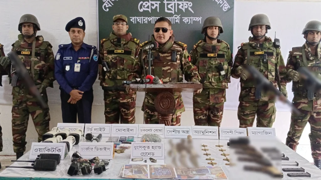 যশোরের বাঘারপাড়া উপজেলায় যৌথ বাহিনীর বিশেষ অভিযানে বিপুল পরিমাণ অবৈধ অস্ত্র ও বিস্ফোরক উদ্ধারের ঘটনায় প্রেস কনফারেন্স করেছে সেনাবাহিনী।