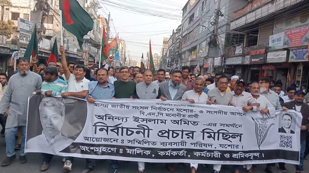 যশোর সদর আসনের বিএনপি মনোনীত প্রার্থী অনিন্দ্য ইসলাম অমিতের পক্ষে নির্বাচনী প্রচার মিছিল করেছে সম্মিলিত ব্যবসায়ী পরিষদ। রোববার বিকেলে শহরের মনিহার এলাকা থেকে এ প্রচার মিছিল বের হয়ে বিভিন্ন গুরুত্বপূর্ণ সড়ক প্রদক্ষিণ করে টাউন হল ময়দানে এসে শেষ হয়।